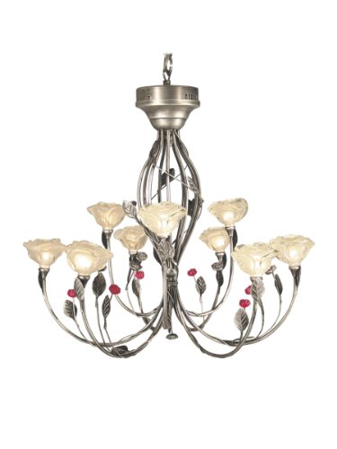 TH60356 Features: -White rose chandelier. Includes: -Accommodates Nine 5W halogen (included).-4' Chain and 6' wire included. Color/Finish: -Antique silver finish. Dimensions: -Glass dimensions: 3.25'' Dia.-Overall dimensions: 19.5'' H x 23'' W.