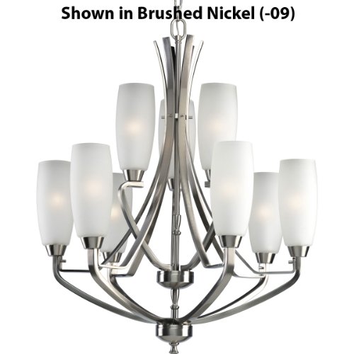 Progress Lighting P4439-20 Nine-light, two-tier chandelier with etched glass and arching rectangular arms with strap accents. Antique Bronze Westin Collection Antique Bronze 9-light Chandelier The Westin Collection features sweeping arcs framing elegant, tapered glass shades. Cool and modern with a casual flair, Westin provides a signature look to any room. Antique Bronze finish Etched glass 27 In. Diameter x 33-3/8 In. Height Uses (9) 60-watt candelabra bulbs
