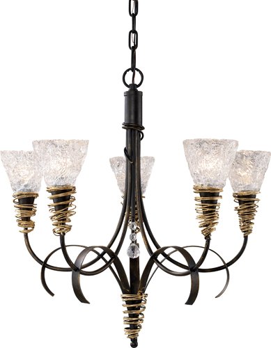 The dazzling design of the Equinox 5-light chandelier combines clear textured glass with black finish metalwork and gold finish highlights. From Landmark Lighting.