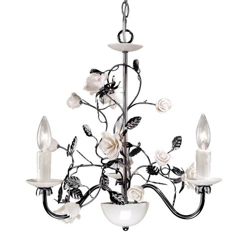 MCT033 Features: -Three light chandelier.-Features ceramic bobeche and cream porcelain roses.-UL and CUL listed for dry location.-108'' Silver cord. Construction: -Steel and ceramic construction. Color/Finish: -Gun metal finish. Specifications: -Accommodates (3) 60W E12 candelabra base bulb. Dimensions: -Chain length: 72''.-Canopy dimensions: 2.5'' H x 5.75'' W.-Overall dimensions: 20.75'' H x 20.25'' W x 20.25'' D.