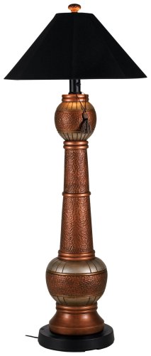 Add casual elegant styling and light to your outdoor living area. Phoenix lamps feature all resin construction with a heavy weighted antiqued copper and brushed pewter base with carbon black accents with black canvas Sunbrella shade cover. Lamps are completely weatherproof and have a two level dimming switch and weatherproof cord and plug, 12 ft. on the floor lamps, 16 ft. on the table lamps. Unbreakable poly-carbonate waterproof light bulb enclosure allows the use of a standard 100 watt light bulb.