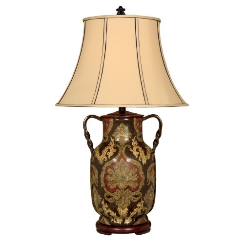 Light Bulb:(1)150w A21 3-Way Med F Incand Beautiful classic urn with a red and yellow floral design on a brown background. Comes with a beige shade with black piping.