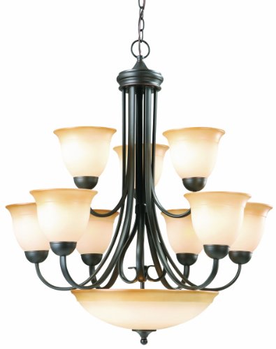 Finish:Oil Rubbed Bronze, Glass:Antique Glass, Light Bulb:(11)60w A19 Med F Incand Graceful scroll detail on the arms complements flared glass shades Includes 4 feet of chain