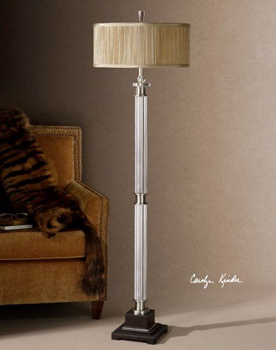 - Fluted glass columns with brushed aluminum details and crystal accents The round drum shade is a silken