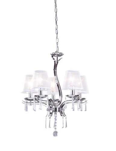 The Artcraft Lighting AC1045CH Roxborough Five-Light Chandelier, Chrome has the following dimensions: 20-Inch long, 20-Inch wide, 24.5-Inch high. White Organza shades on a laser cut chrome plated frame with transitional shaped crystal droplets make this a stunning piece for any home. 5 Light Chandelier. Perfect for the kitchen, foyer and more! Requires 5 60-Watt bulbs with a candelabra bulb base. Artcraft Lighting is dedicated to designing the most fashionable and functional lighting butthe production must be executed as flawlessly as possible becausequality is timeless.